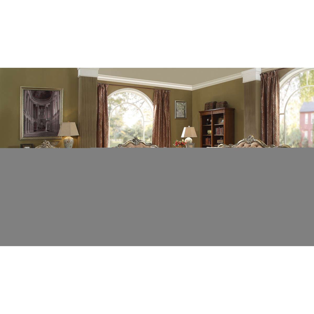 - This piece boasts an elegant design featuring an arched scrolled-floral molding trim and base with an antique finish crafted from poly-resin