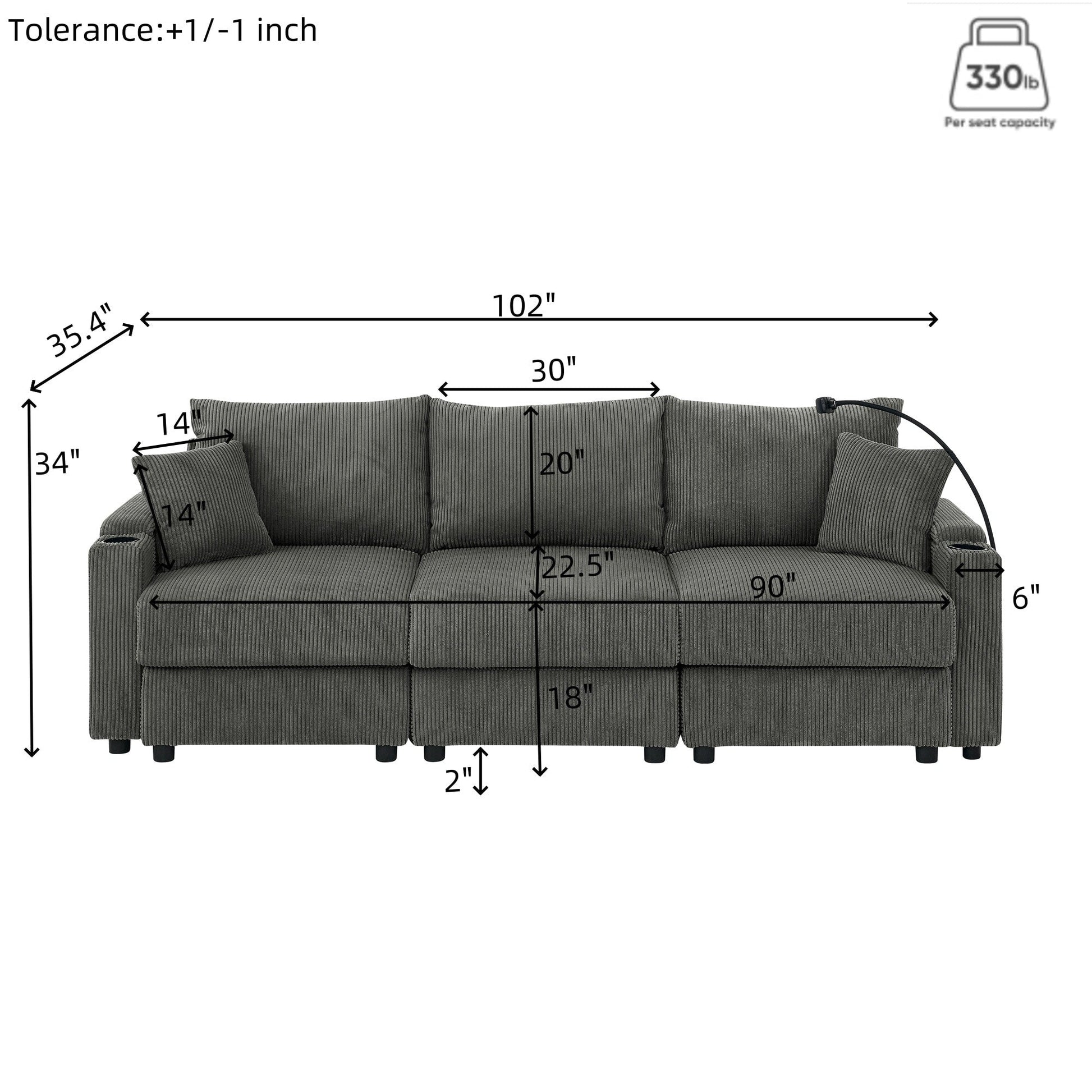 102 Corduroy Modern 3-Seater Sofa Deep Seat with Cup Holders & Phone Holder