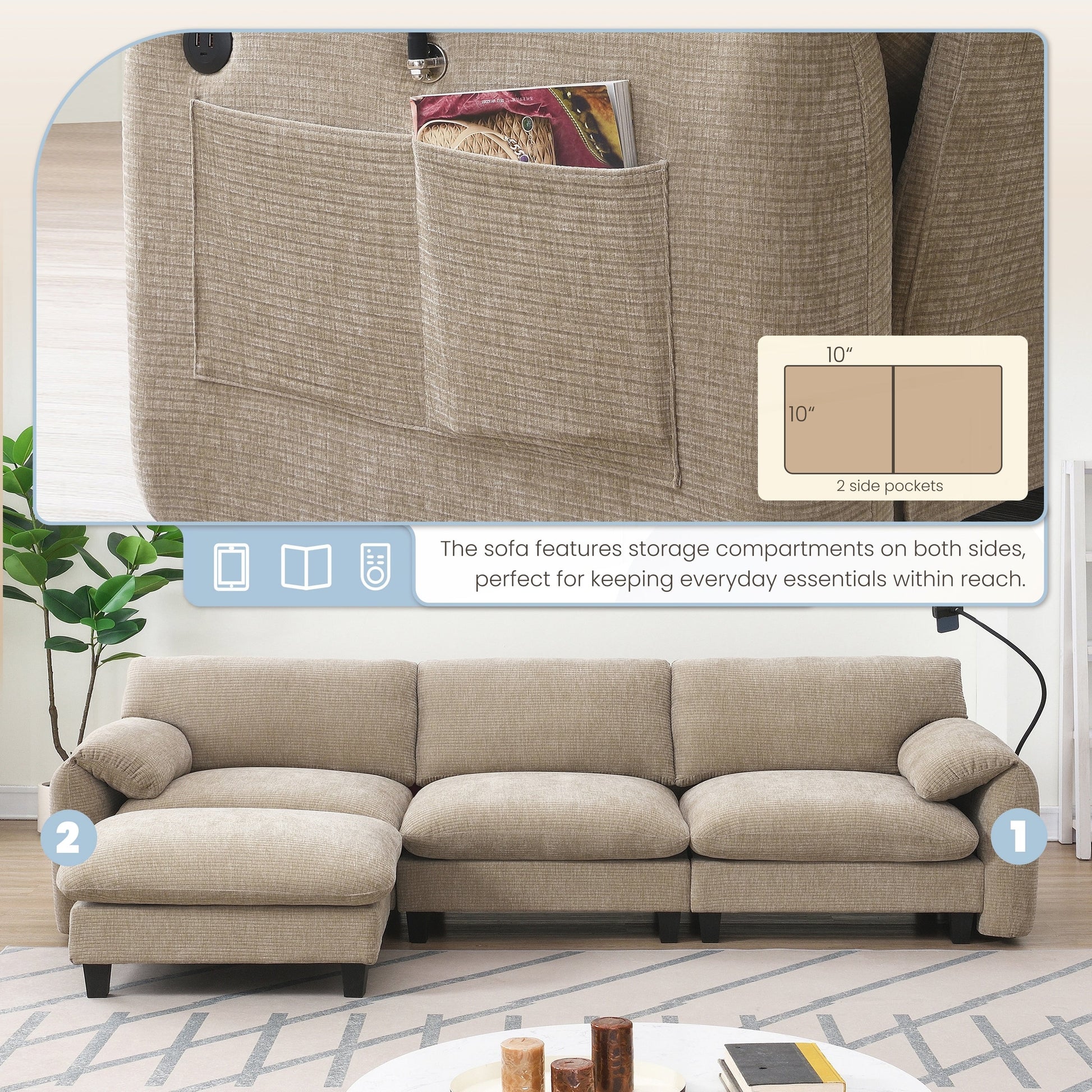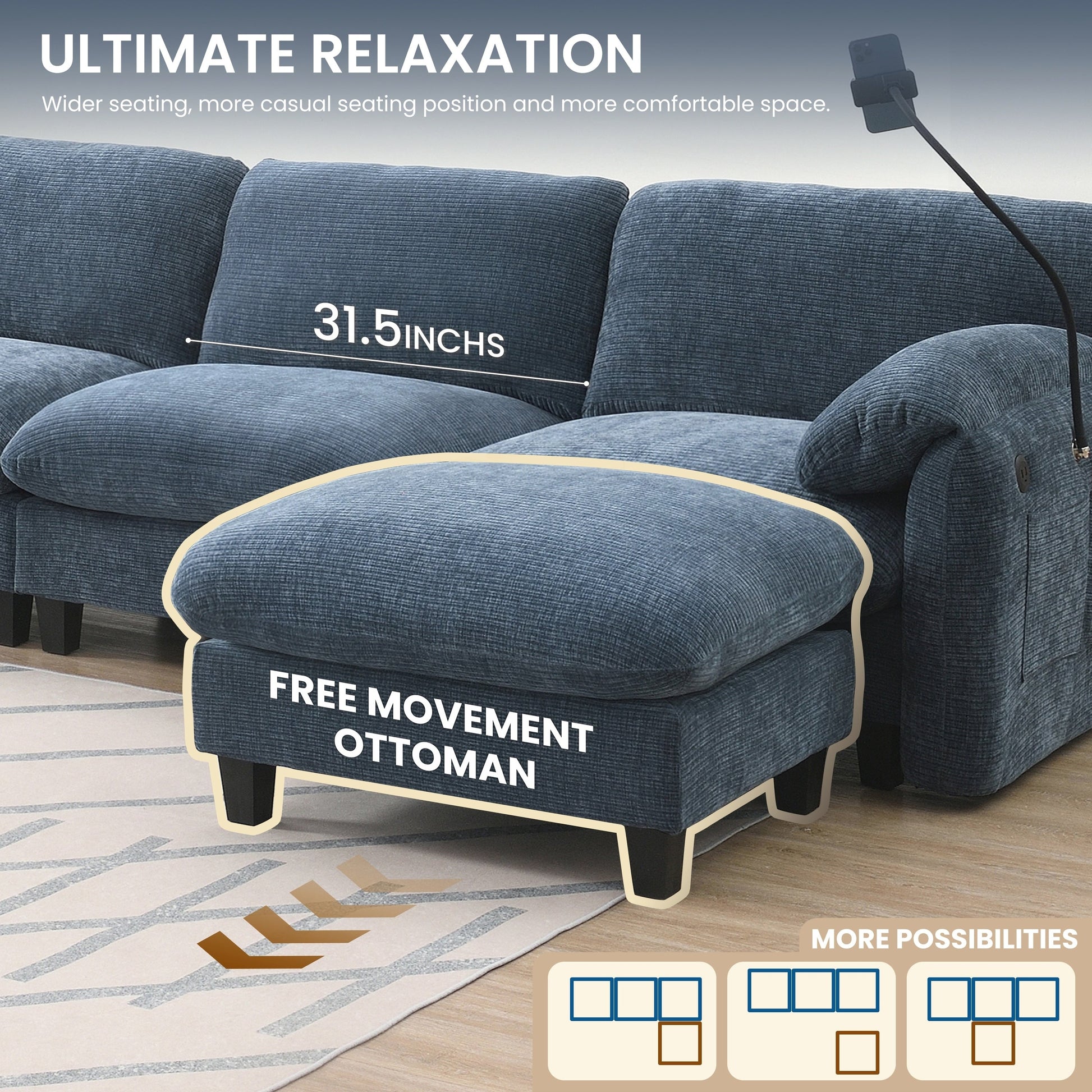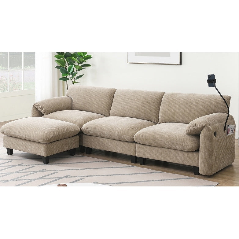 Side Storage PocketsãUSB Charger and phone cradleï¼?Designed with storage pockets on both sides, this sofa makes it easy to keep essential items like books, magazines, or remote controls within reach. USB Charger and phone cradle are practical for everyday use, helping to reduce clutter and make your living space more organized. Convenient Armrests: Having armrest pillows on both sides of the sofa provides extra support and comfort for your arms and shoulders. They offer a place to rest your arms while sitting, making it easier to maintain a relaxed posture. Movable Ottomanï¼?The sofa comes with a removable ottoman, which can be repositioned as needed. Whether used as extra seating, a footrest, or a coffee table, the ottoman adds versatility to the layout. You can move it to any part of the room to suit your seating preferences or change the arrangement to suit different
