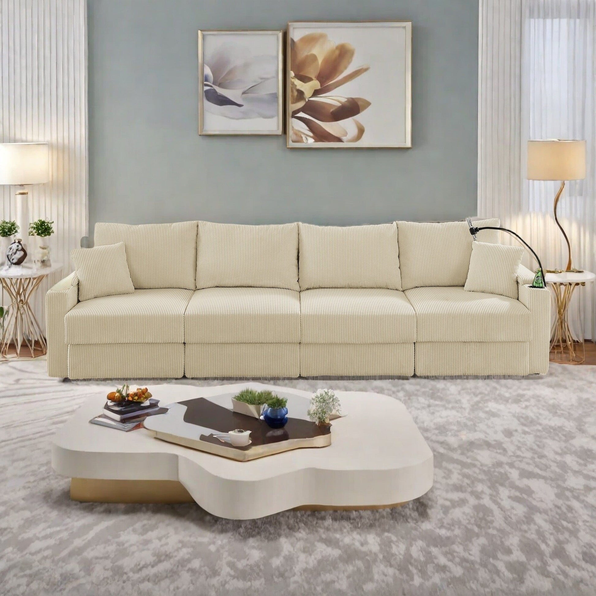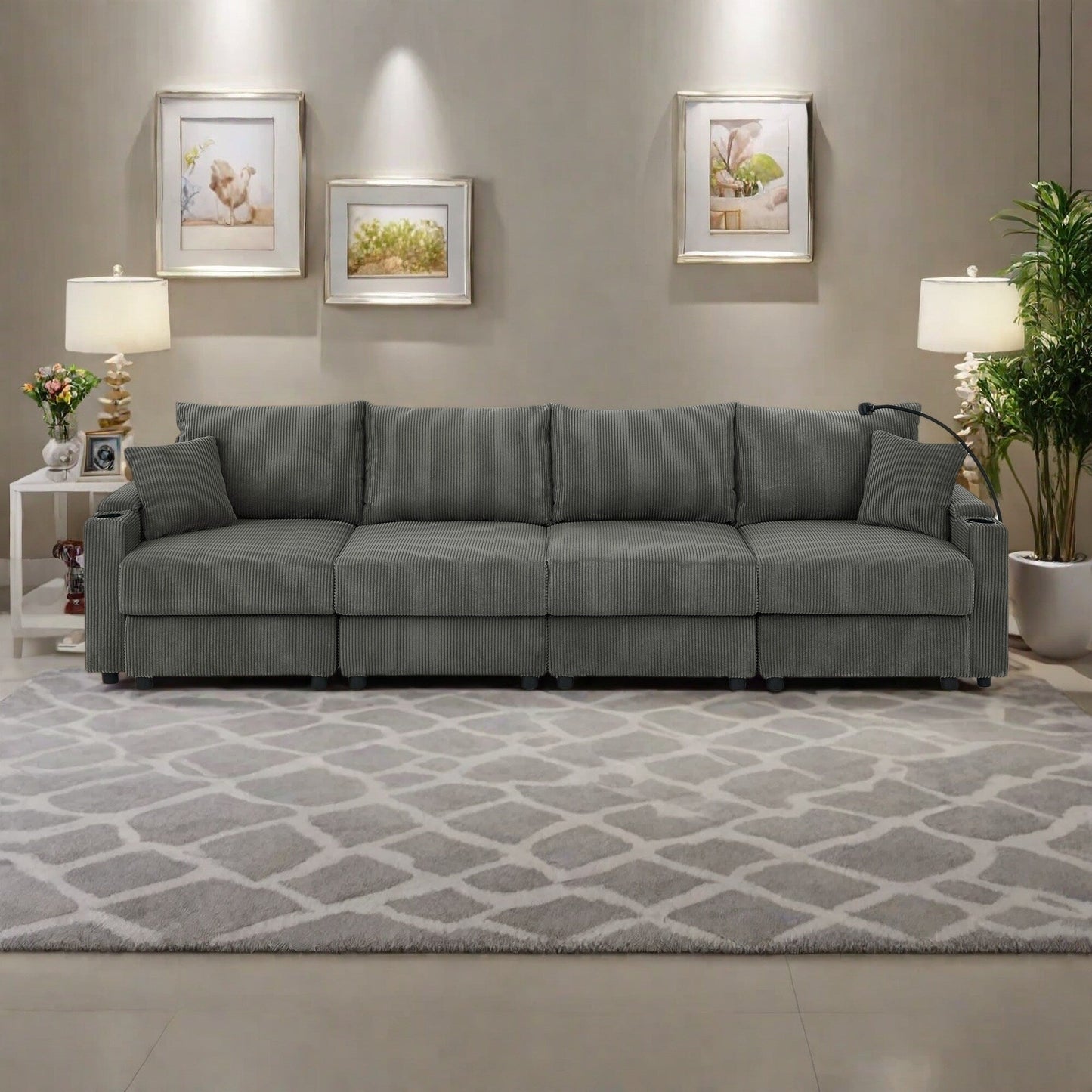 132 Corduroy 5-Seater Sofa with Cup Holders and Phone Holder,High-Density Cushions