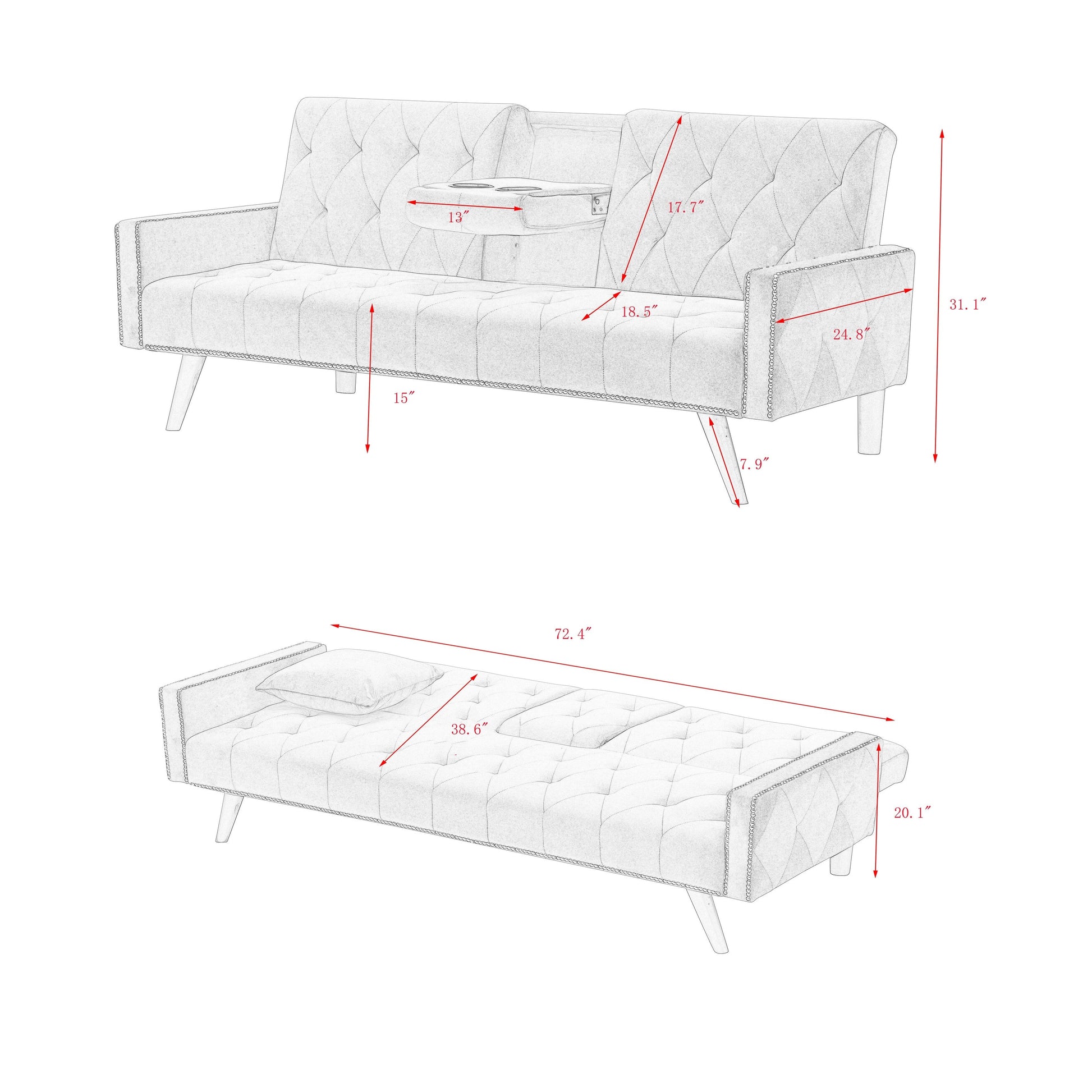 1730 Sofa Bed Armrest with Nail Head Trim with Two Cup Holders 72 Pink Velvet Sofa for Small Spaces