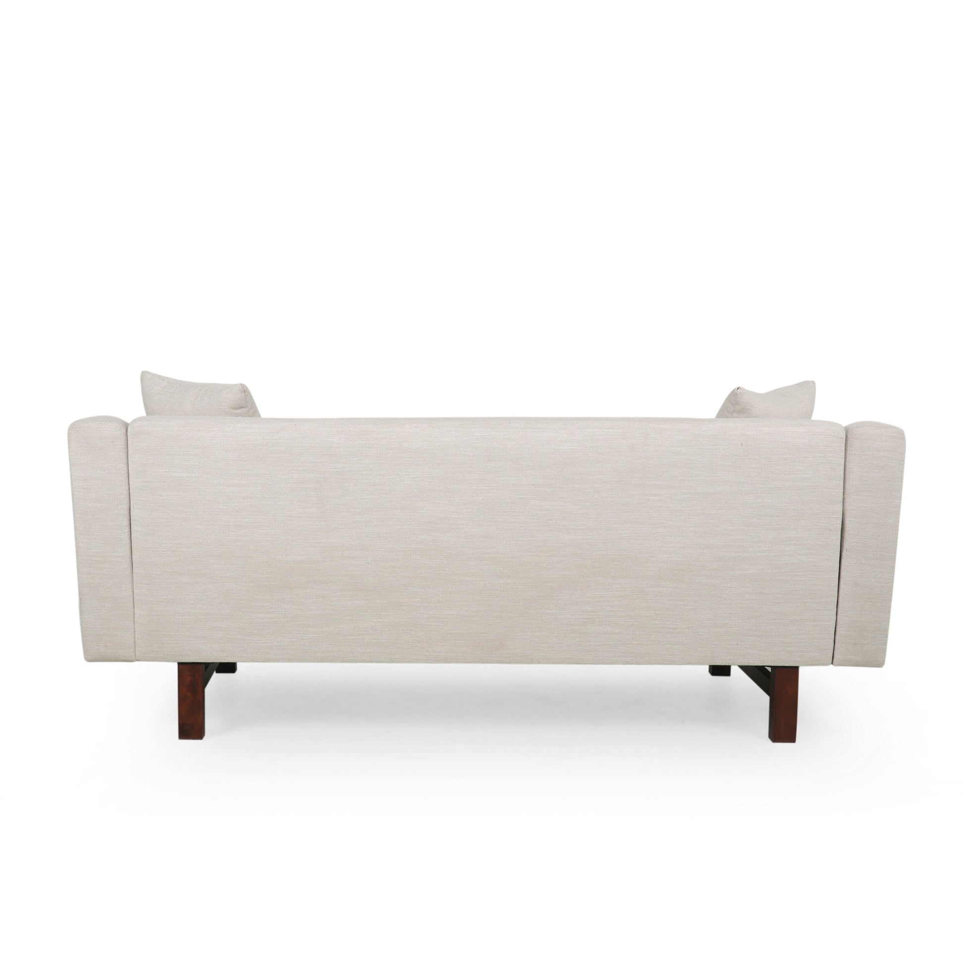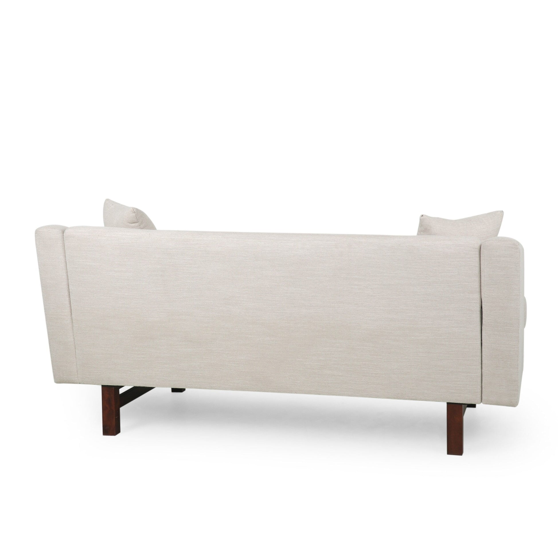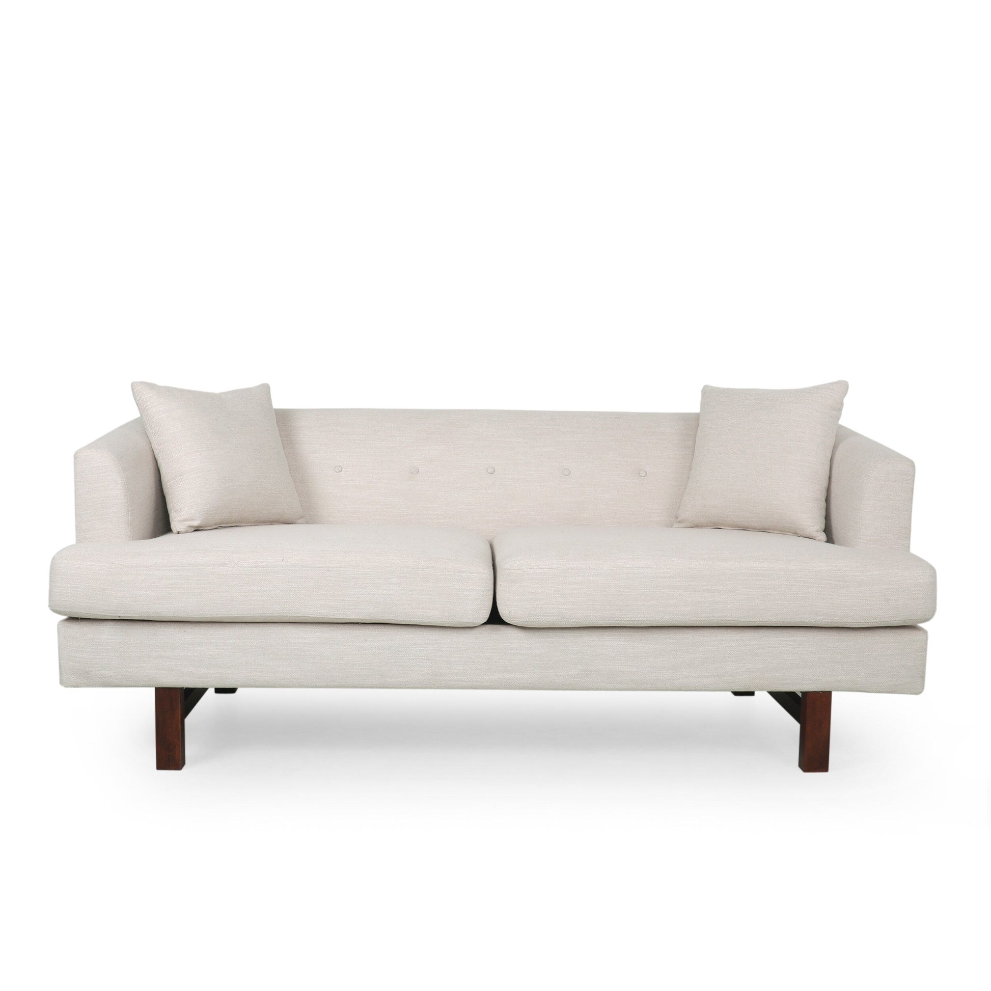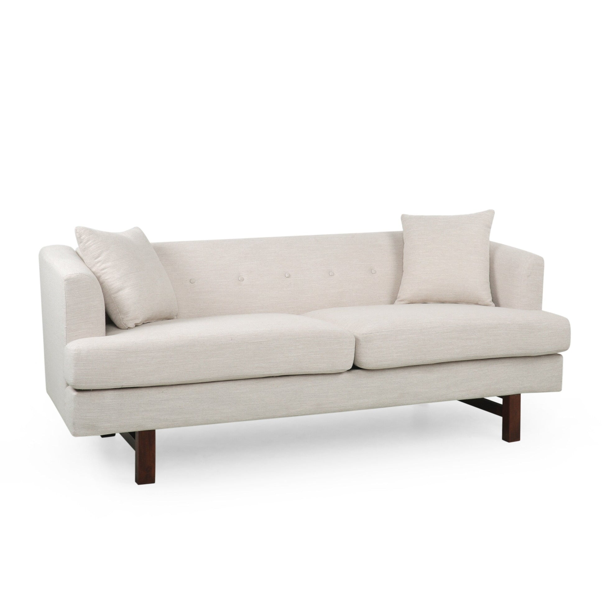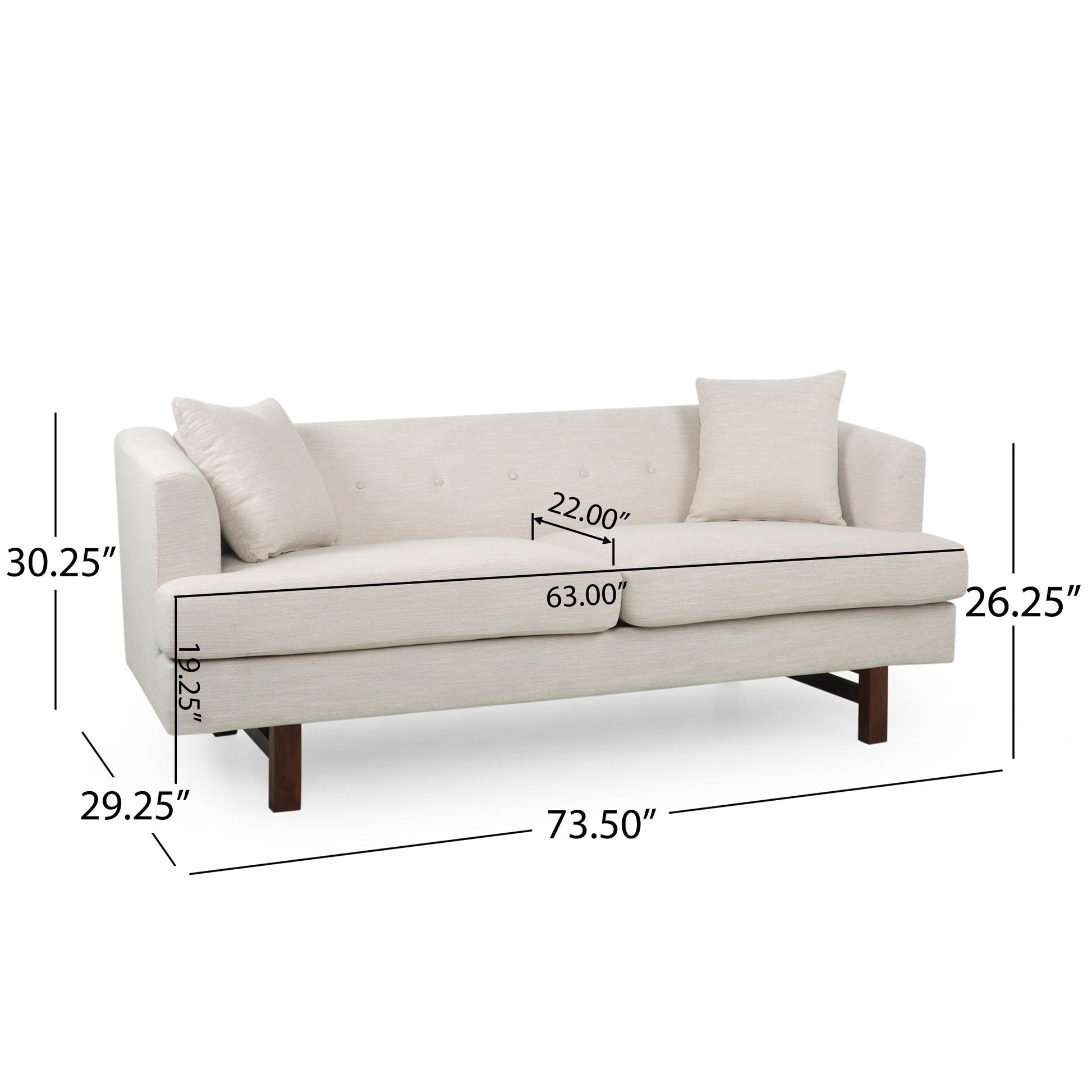 This takes a gorgeous classic look and brings an impressive modern twist, easily anchoring your decor in an atmosphere of mid-century modern elegance. This sofa is perfectly balanced atop bold wood legs and is topped with loose accent pillows, bringing stunning style and outstanding durability to your home.MID-CENTURY DESIGN: Blending together straight wood legs with clean lines and smooth upholstery, our sofa offers a mid-century look to your lounge space. With its clean lines and understated look, this sofa uses new materials to reimagine a traditional design.UPHOLSTERED: Our sofa is generously upholstered, giving any room a refined appearance. This provides a smooth, immaculate texture for this piece as well as cozy cushioning for plush seating.ACCENT PILLOWS: The square accent pillows help tie this contemporary sofa together, balancing out its turned legs and rounding out the sofa in general. This adds an extra dash of comfort to the piece.BIRCH WOOD LEGS: This sofa is supported by bold birch wood legs which offer an attractive look and durable structure. Its fine grain takes stains well, giving this piece a gorgeous finish.DIMENSIONS: Choose an accessory that is the perfect size for you and your furniture. This sofa is 73.50' W x 30.25' D x 29.25' H. You will love how much your space can transform with the simple addition of this charming couch.