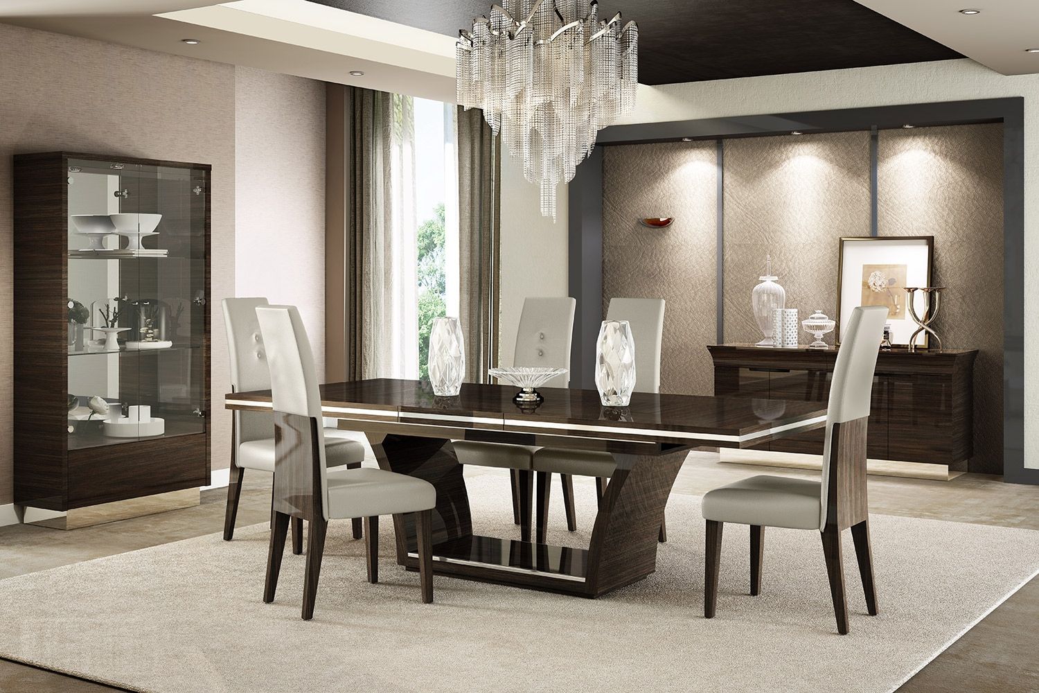 Table à manger extensible moderne D832 de Global United. La collection D832 est une grande et belle collection de meubles de salle à manger, fabriquée en bouleau velours foncé laqué brillant. Elle est dotée d'un piétement sur pied et d'une rallonge. Les chaises sont dotées d'une assise et d'un dossier en velours, très faciles à nettoyer. L'ensemble D832 comprend également un buffet, un miroir et une vitrine 2 portes assortis. Conçue en Italie, cette collection présente une silhouette moderne qui s'harmonise parfaitement avec le reste du mobilier. Tous les meubles sont vendus séparément.