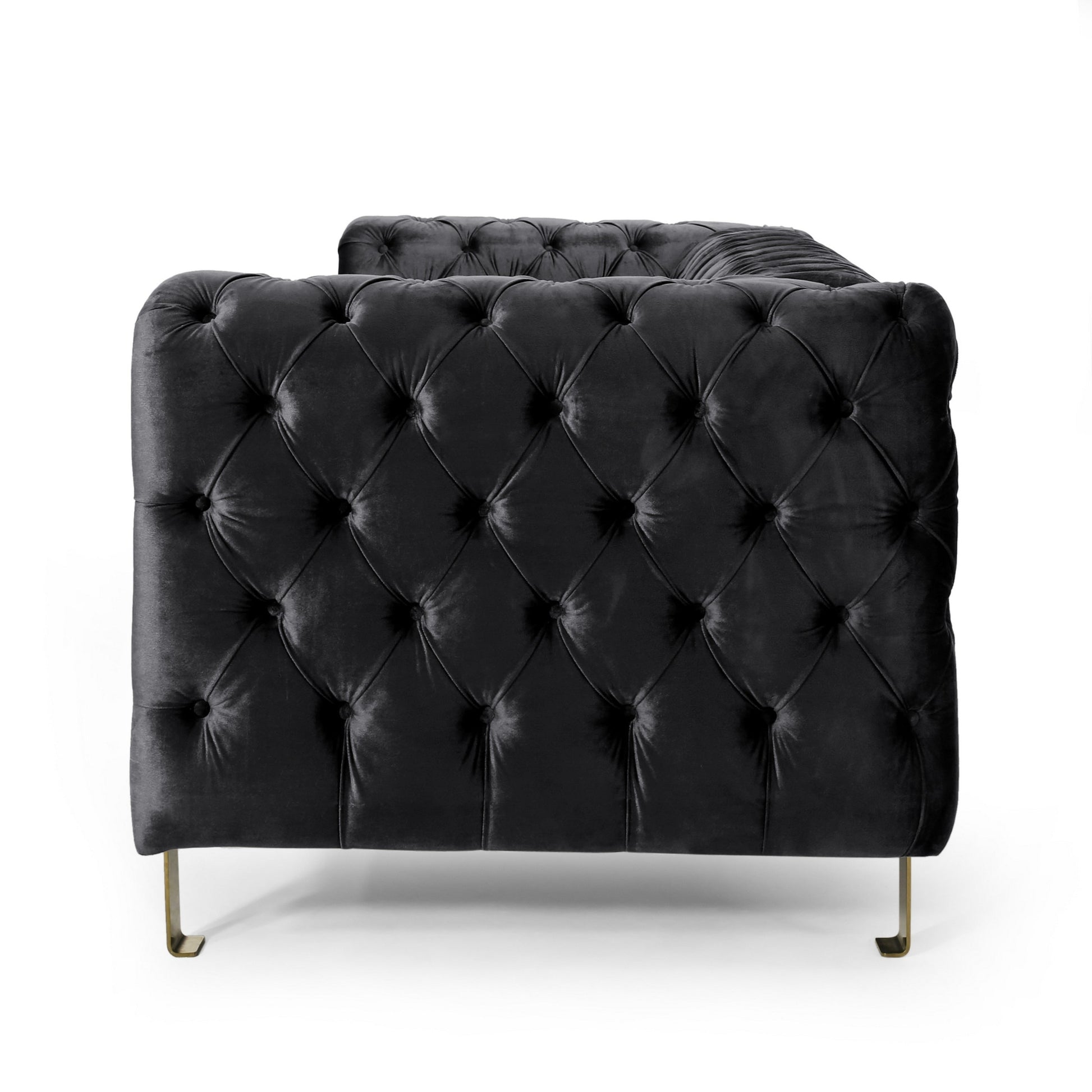 Nua Sofa, Chesterfield Tufted Black Velvet, 84 Inch, Modern Gold Legs