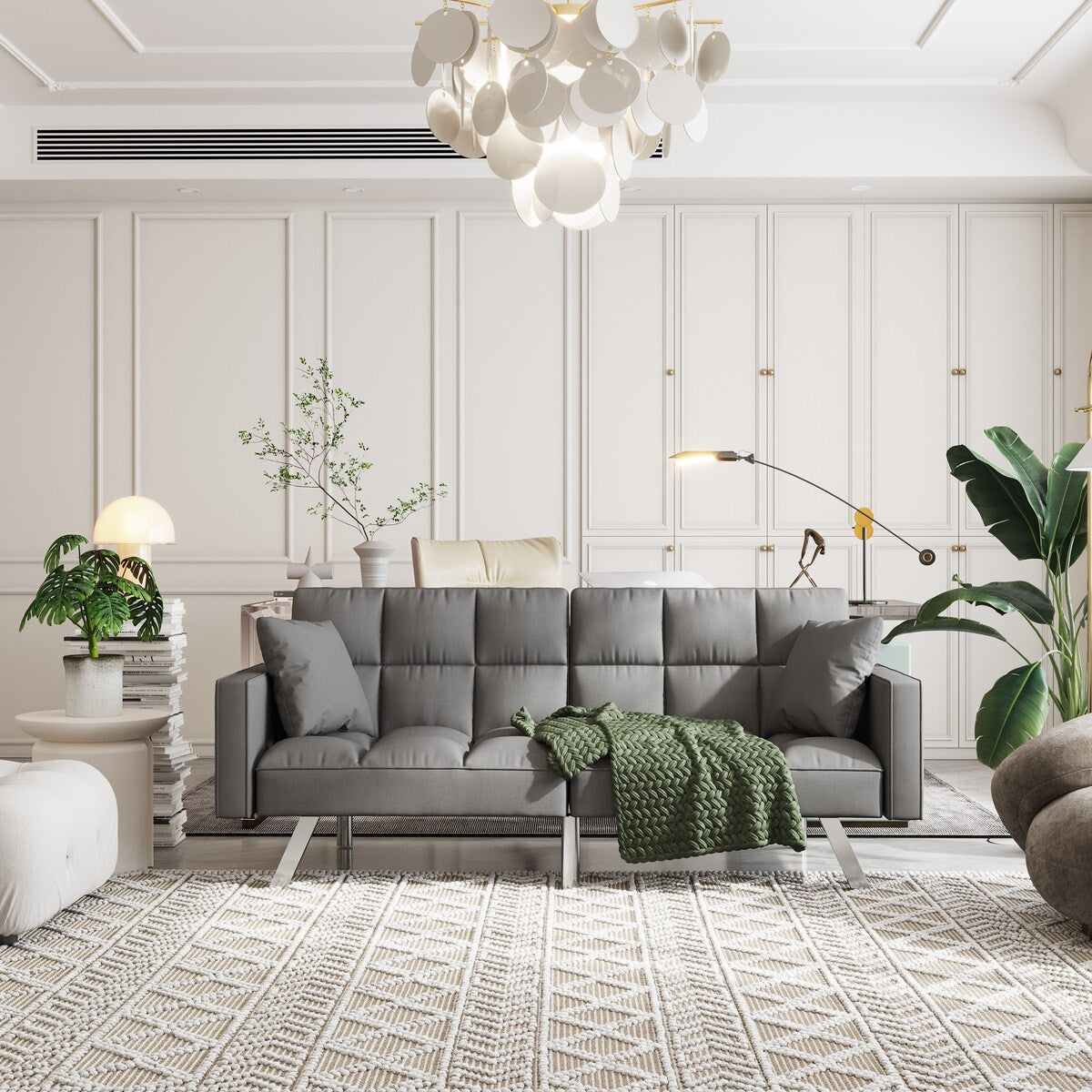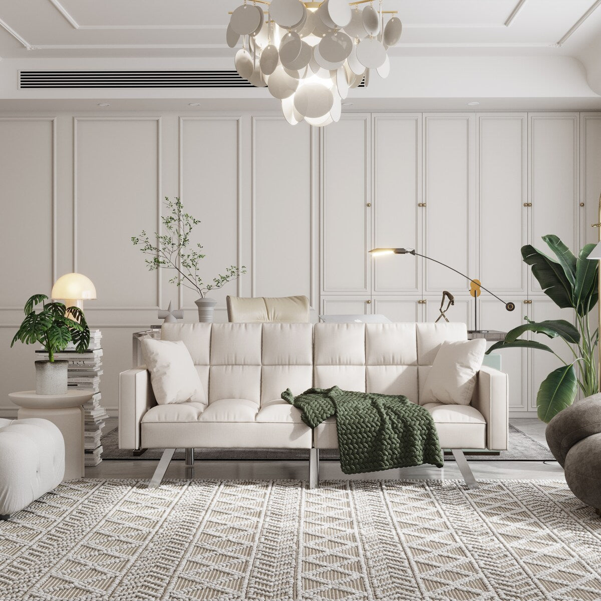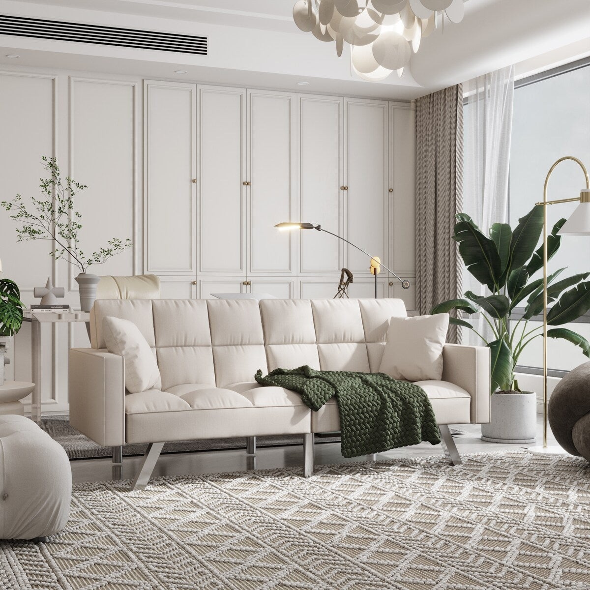 Upgrade your small space living with this stylish and versatile Velvet Sofa Couch Bed. With armrests and 2 pillows, this loveseat sofa bed helps you create the perfect environment for both work and relaxation. The adjustable back easily converts this sofa into a comfortable bed, making it a great solution for overnight guests. The split-back design allows for multiple lounge positions, accommodating personal preference. Crafted with high-quality velvet fabric and chrome metal legs, this sofa bed provides both comfort and durability. Plus, assembly is a breeze with the included detailed instructions.