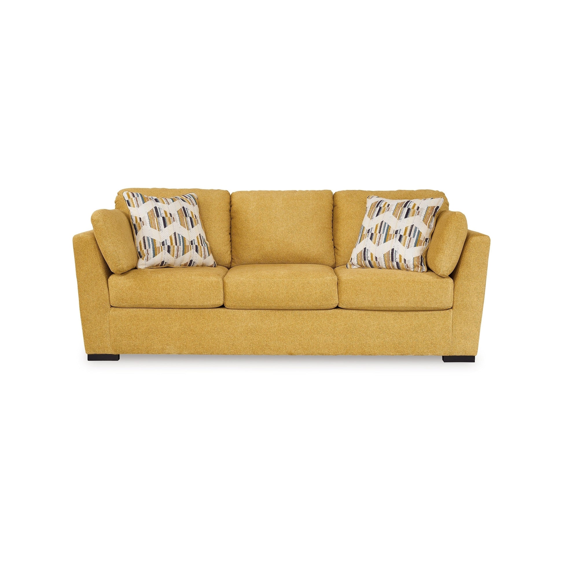 Add a touch of bold elegance to your space with this sunflower-yellow sofa. Wrapped in soft, velvet-like polyester upholstery, this exquisite piece offers a cozy yet stylish seating experience. The reversible seat cushion and plush accent and bolster pillows ensure maximum comfort, while the sturdy platform foundation resists sagging over time. Check out our Viena collection for more options.