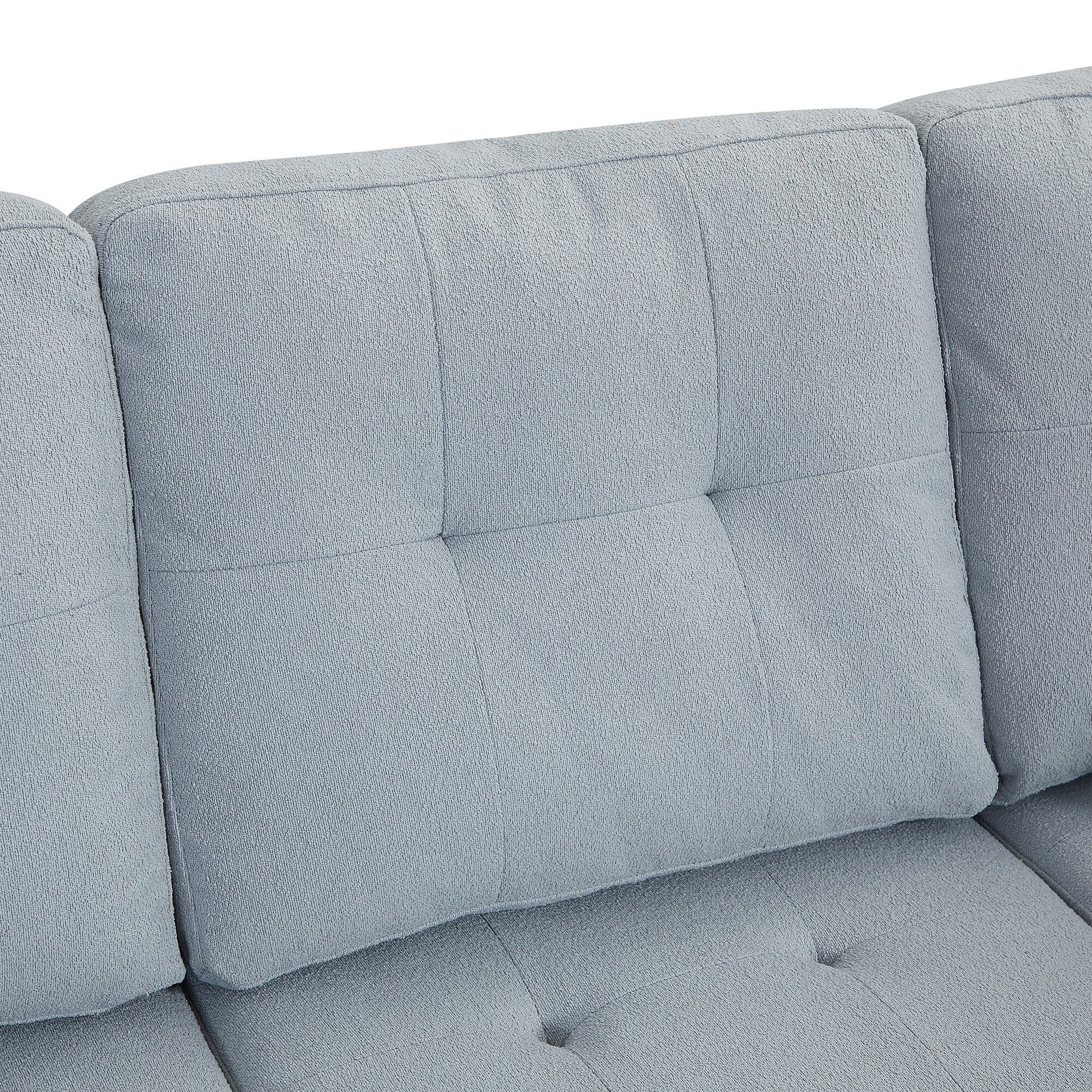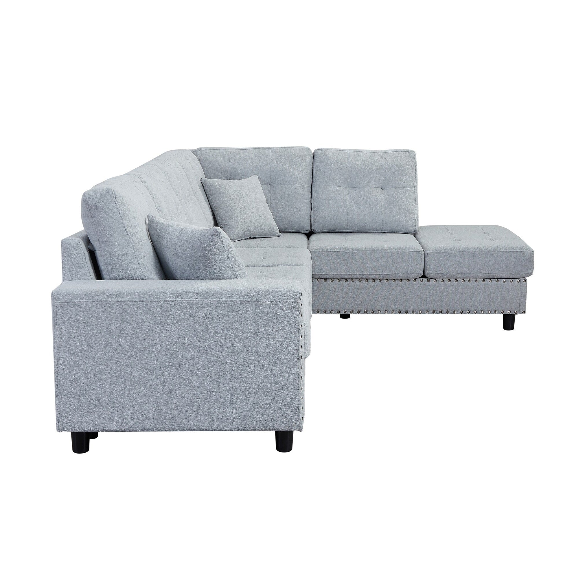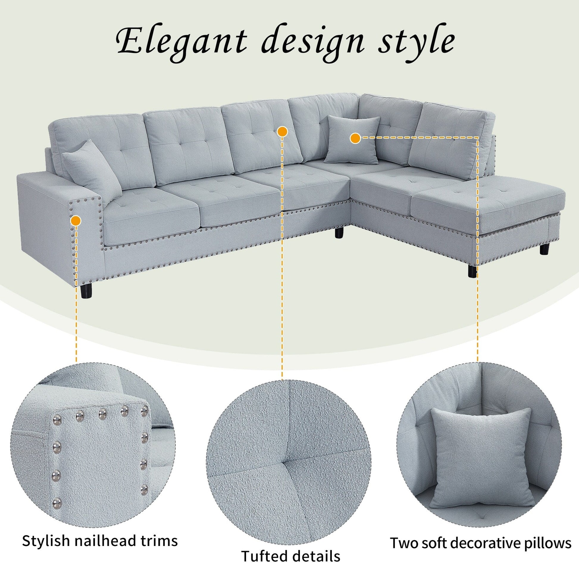 - This L-shaped modular sofa blends vintage charm with modern comfort. Upholstered in stylish linen and detailed with classic nailhead trim, it features soft cushions, a sturdy wood frame, and removable pillowsâsuitable for living rooms, offices, or apartments.