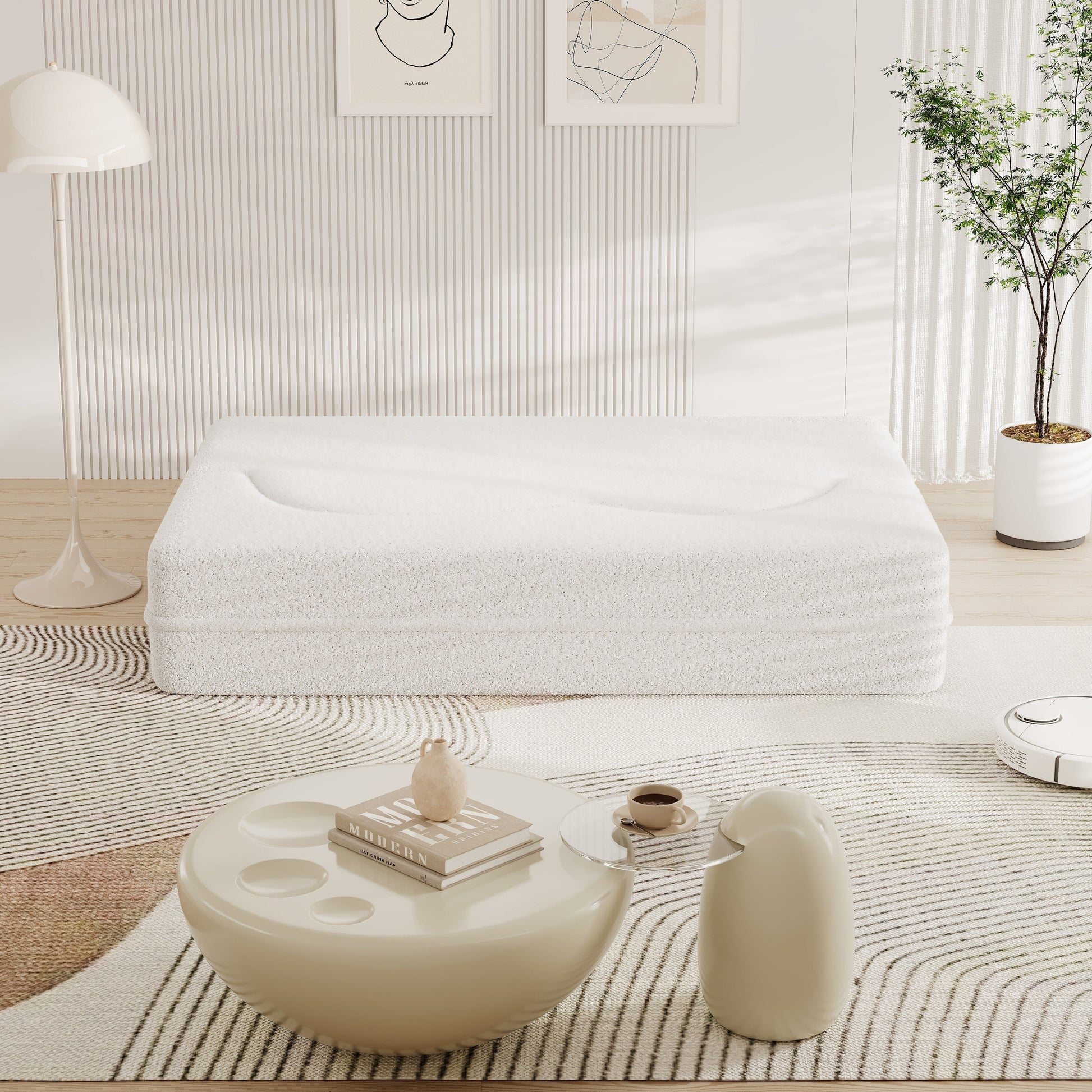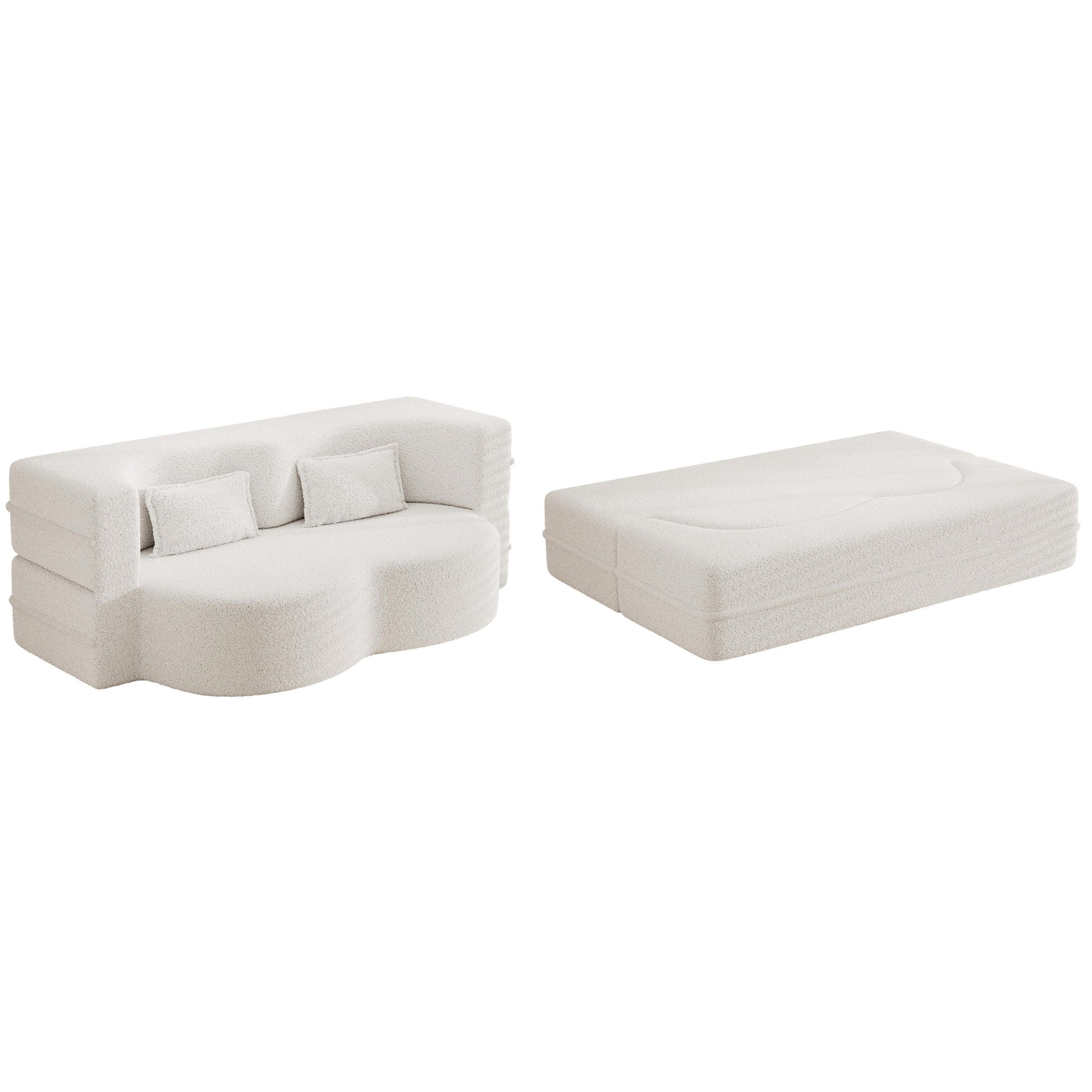 White 78 Convertible Teddy Fabric Loveseat Foam-Filled Floor Sofa Bed with 2 Pillows and Folding Mattress for Living Room