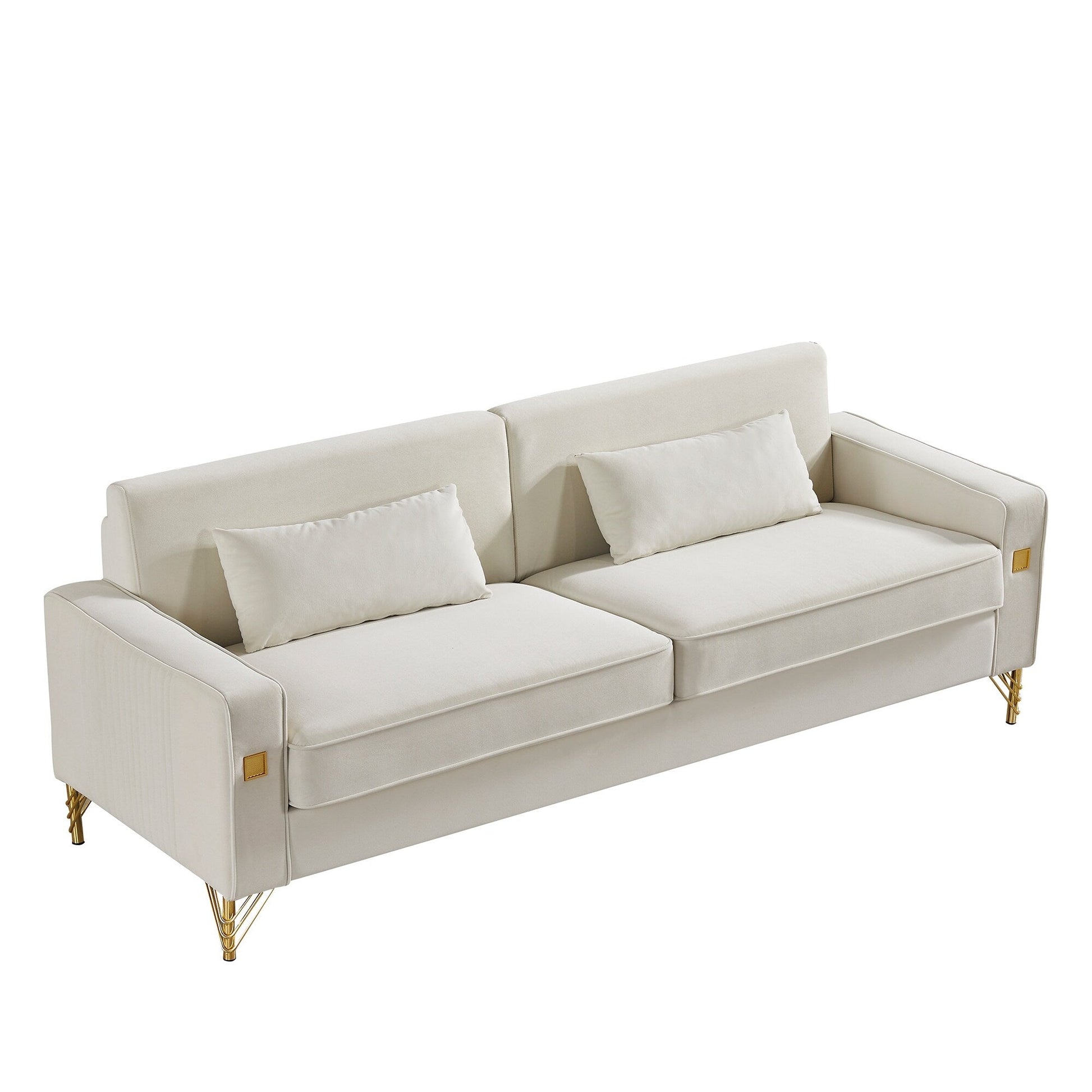 White Modern 85.44 Velvet Upholstered Loveseat Sofa with Gold Legs and Pillows for Living Room