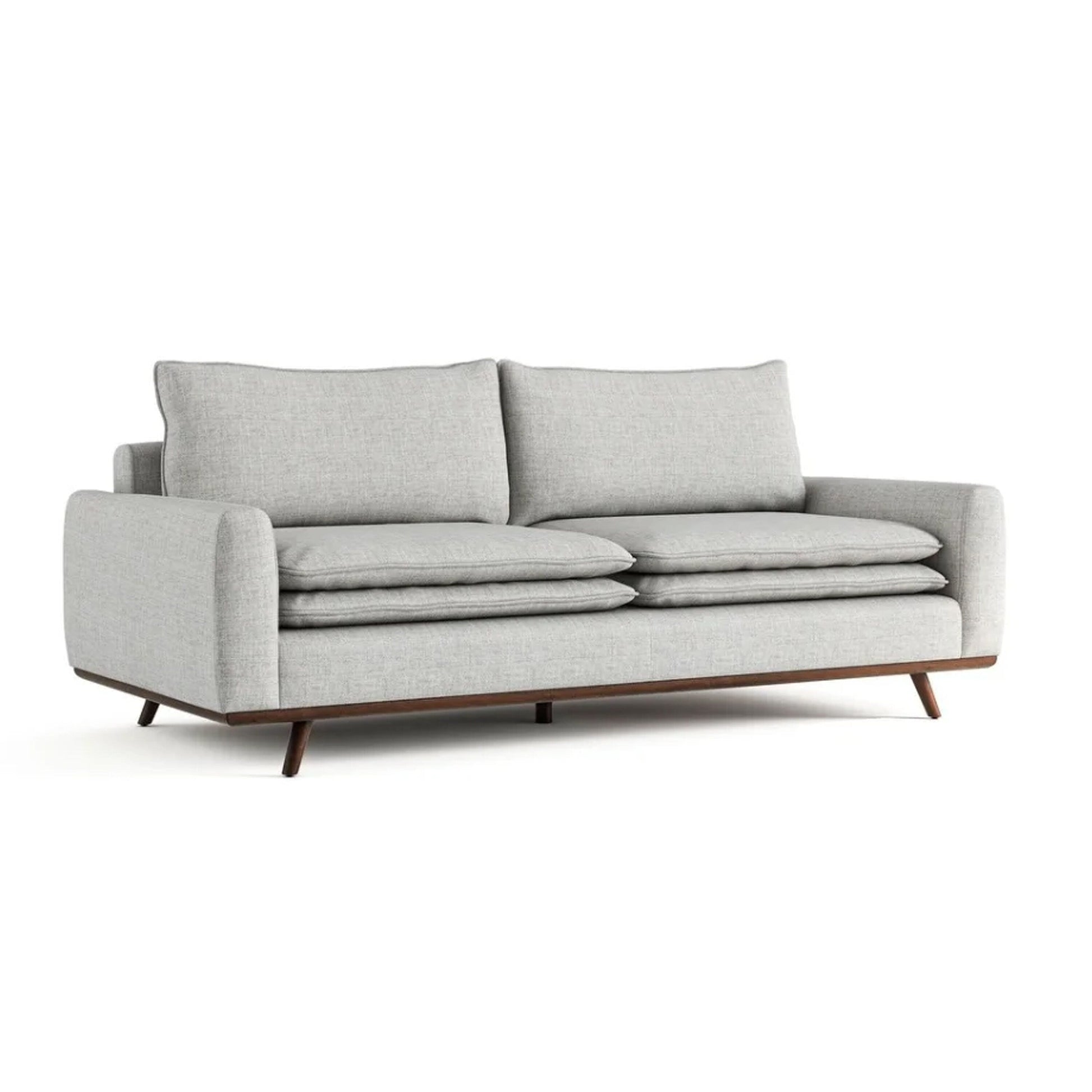 Elevate your space with this mid-century modern sofa, featuring a cotton-linen upholstery in a light gray color. The feather blend back pillow and high-density foam seat cushion provide comfort, while the dark brown solid wood frame and legs ensure durability. Designed for longevity, it boasts a webbing and zigzag spring suspension for support. Check out our Yaana collection for more options.
